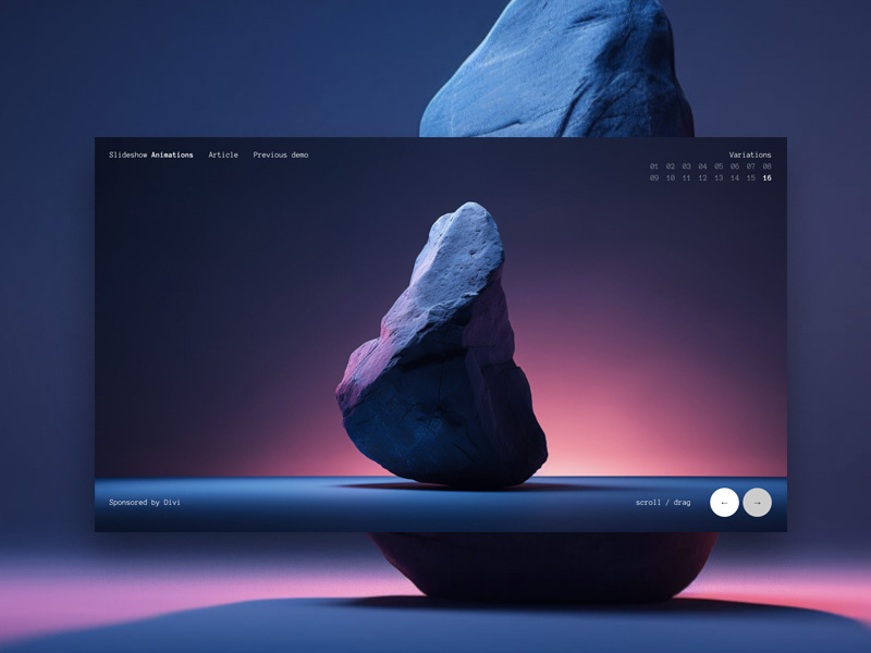 Slideshow Animations A collection of ideas for slideshow animations. Article on Codrops Demo Installation Run this demo on a local server. Credits Images generated with Midjourney Misc Follow Codrops: Twitter, Facebook, GitHub, Instagram License MIT Made with 💙 by Codrops