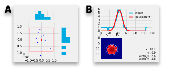 B. Gaussian fit When extracting the z position of a bead the resulting Gaussian fit is shown here. When using the x,y,z extraction the 2D Gaussian fit is shown as well. See Coordinates tables on how to determine the z position of a bead.