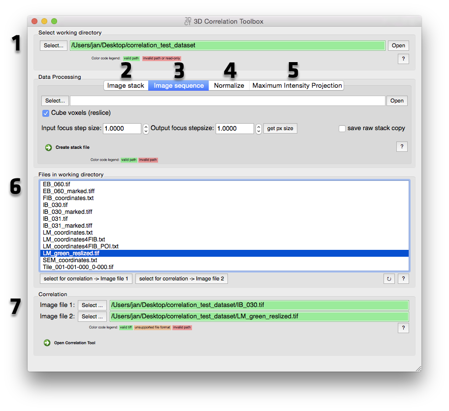 Start Correlation Module For 3D to 2D correlation select a tiff image stack (3D) and a single tiff image (2D) from the working directory file list (6) or drag valid tiff files onto the address bar. Select tiff image stack files for 3D to 3D correlation or single tiff images for 2D to 2D correlation. Hit "Open Correlation Tool" to start the correlation module. See Correlation for more details.