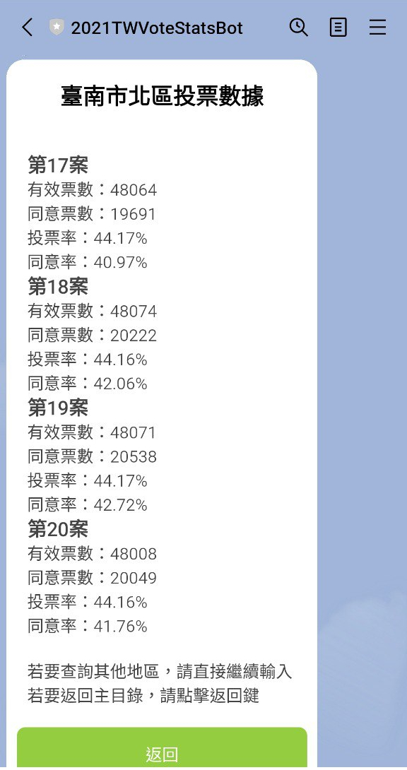 縣市-鄉鎮市區-村里,以-,_分隔皆可,允許只輸入縣市-鄉鎮市區或縣市 voteStatsRegion: 顯示輸入地區之投票結果,允許再次輸入,或點擊返回目錄回到menu