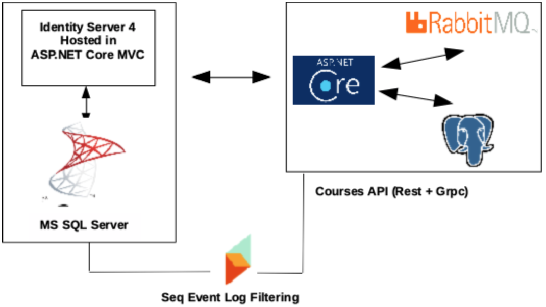 - courses-api: An ASP.NET.Core API that provides http and Grpc endpoints for managing course resources. Swagger is accessible from https://localhost:8002. This provides a DDD Aggregate for managing courses with EF Core and uses MediatR for dispatch of commands and in-process domain events. Autofac is used as an Inversion of Control (IOC) container to simplify the management of object dependencies.
