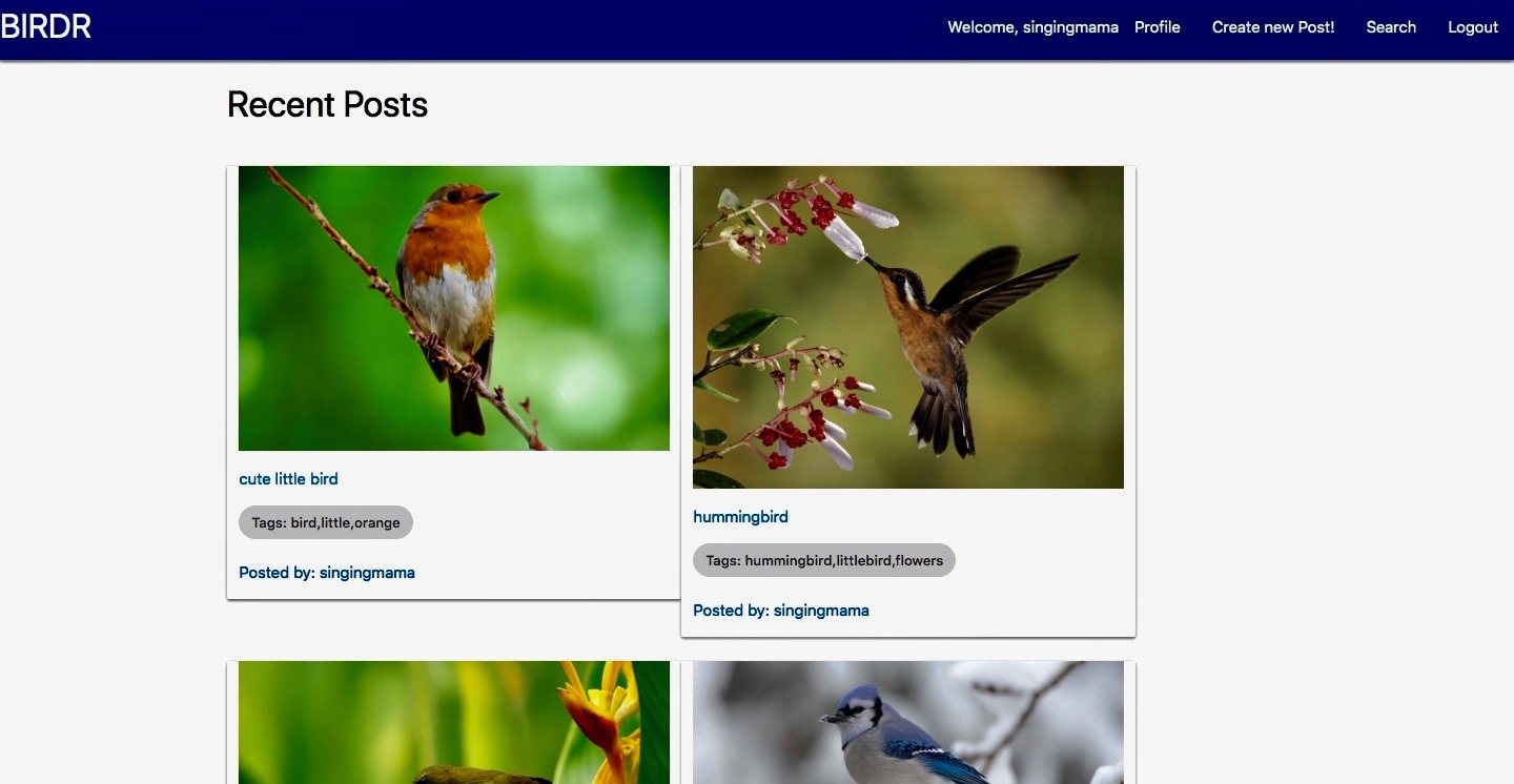 Birdr is a fullstack microblogging application similar to Tumblr. Users are able to create posts to share photos that are hosted on other websites, write blog posts, and tag their posts to enable searching posts by topic.