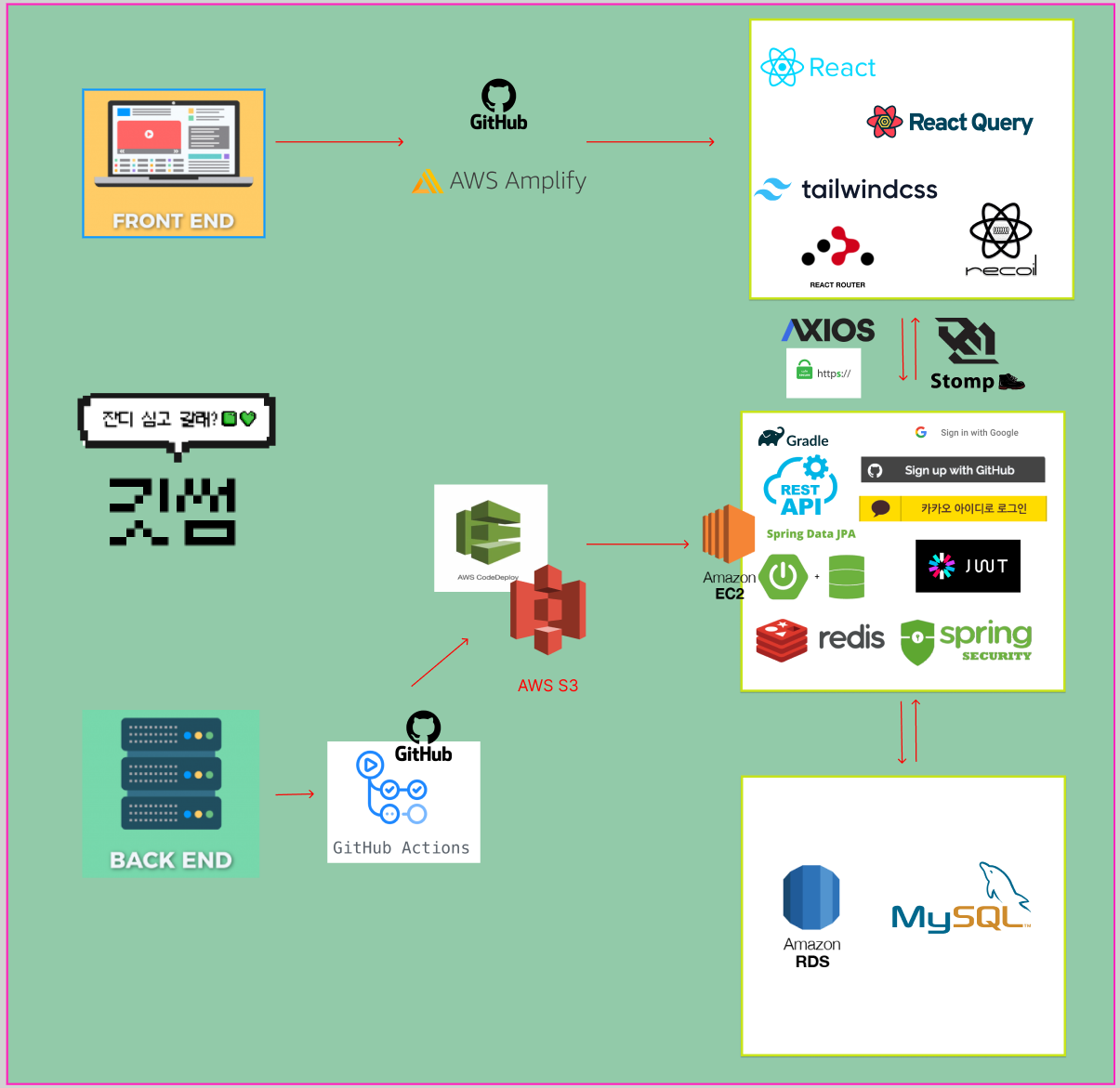 서버의 이벤트를 클라이언트로 보내는 방법 중에 서버에 부하가 덜 오게끔 양방향 통신이 가능한 websocket을 사용했습니다. 채팅 기능을 위해서 기반으로 동작하는 stomp를 이용해 topic을 생성하도록 했습니다.