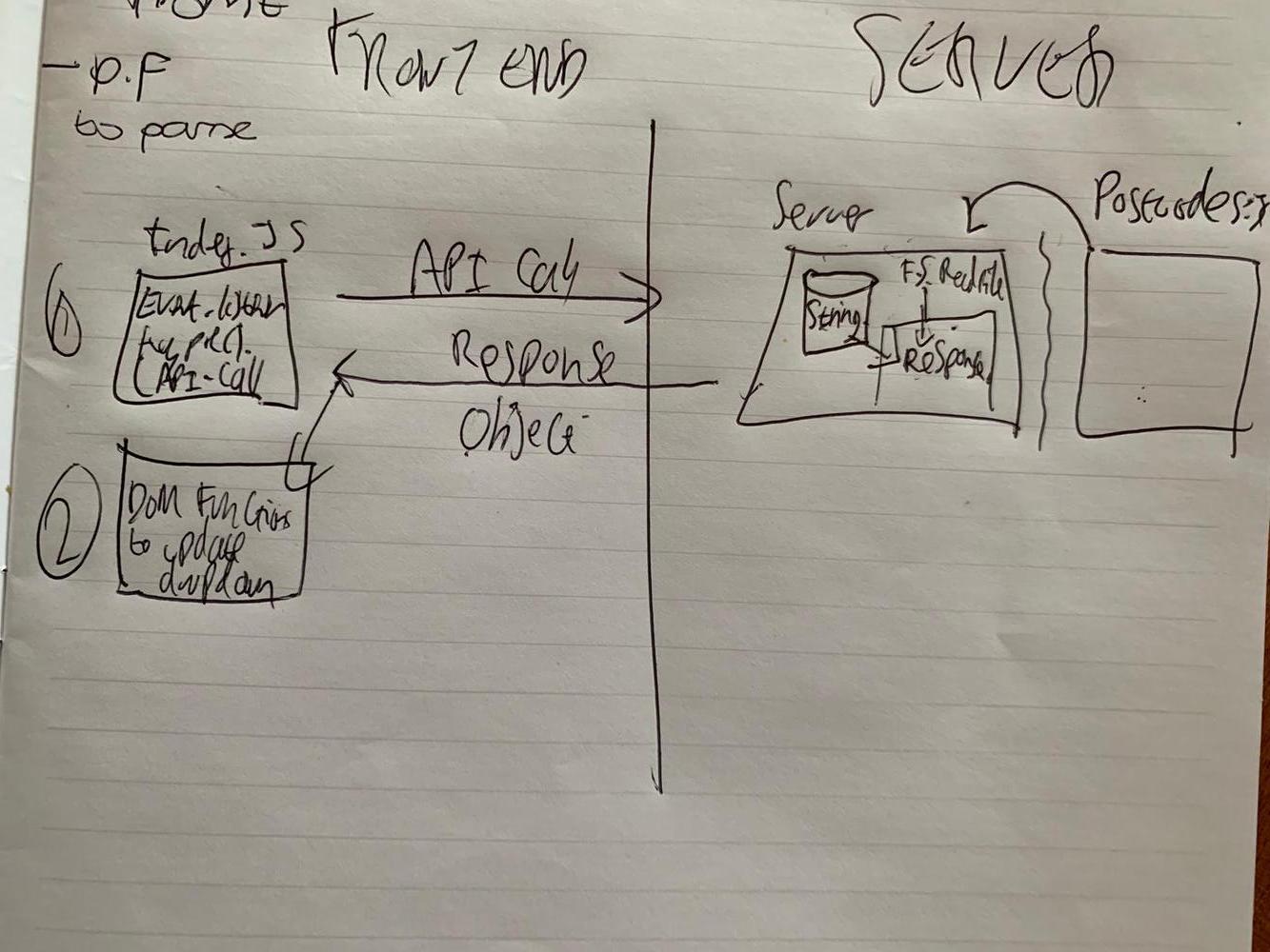 Initially we set up a dummy JSON file and made an API call from the client side to our own backend dummy data. This was successful, however we were unable to make an API call from our server to the Postcodes API, hence we just enhanced our app by making the API call from client side to the Postcodes API.