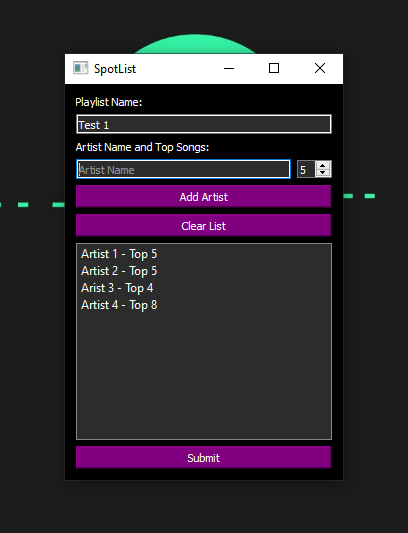 SpotList is a PyQt5-based desktop application that allows users to create Spotify playlists by selecting their favorite artists and specifying the number of top tracks they want to include from each artist. The application uses the Spotify Web API to fetch and compile the desired tracks into a new playlist.