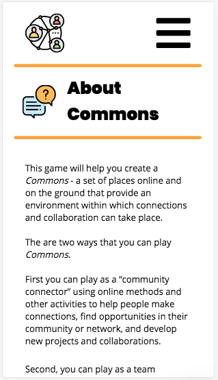 Commons was made by participants of the Founders Program in collaboration with Networked City. It is the digitized version of a workshop game aimed at helping individuals begin to strategize community development, resource allocation and project planning. Designed mobile-first.