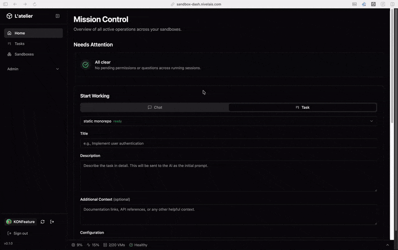- Task dispatch — create coding tasks from the dashboard, Atelier spawns a sandbox, creates a git branch, launches OpenCode with your prompt, and tracks progress. An AI task queue for your team