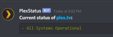 Currently an Alpha Version!!!! PlexStatus2Discord Send the Status from status.plex.tv to Discord Configuration You need to specify Discord Webhook Uri in config.json. HowTo Discord Webhook Information on how to set up a Discord webhook can be found be here. Examples
