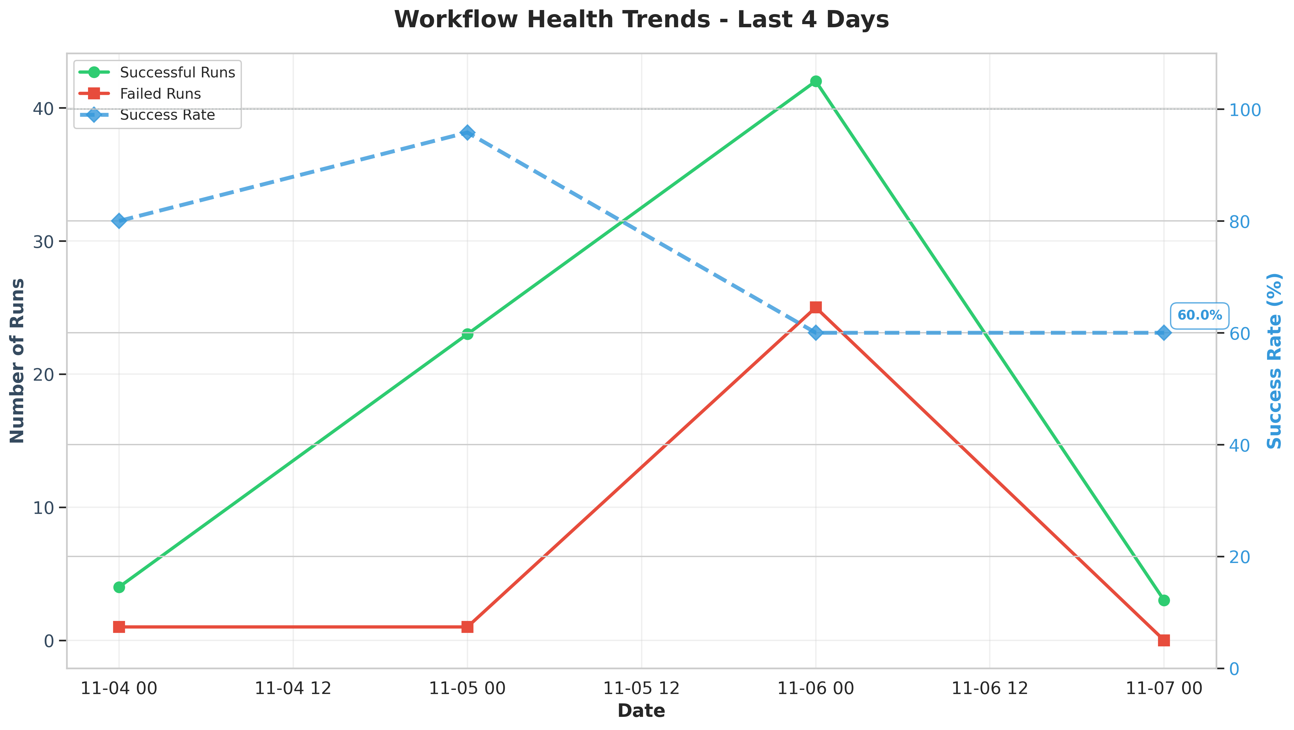 Analysis: The chart shows a concerning drop in workflow success rates on November 6th, falling from 95.83% to 60%. The number of failures spiked to 25 on November 6th, indicating systematic issues affecting multiple workflows. Success rates remained at 60% through November 7th, suggesting ongoing problems that need immediate attention.