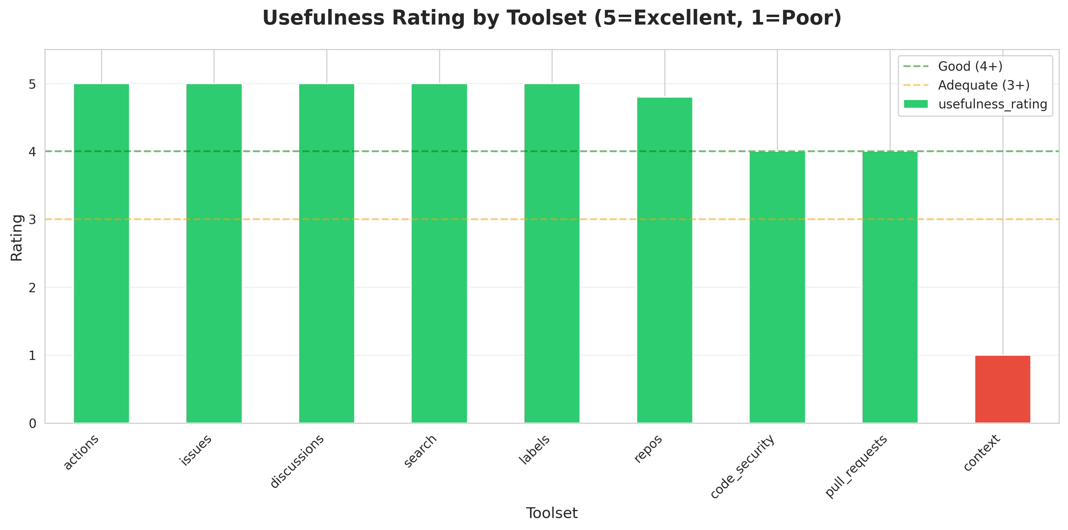 Analyzed 13 GitHub MCP tools across 11 toolsets. Overall usefulness rating: 4.46/5 with 9 tools rated excellent (5/5). Most efficient tool:
