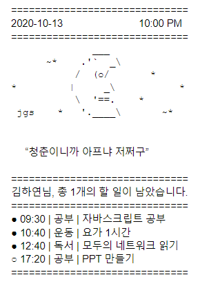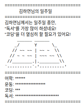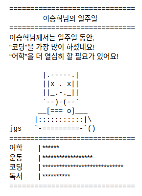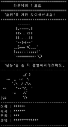 - 일주일 간 많이 한 항목에 해당하는 아스키 아트를 출력합니다.