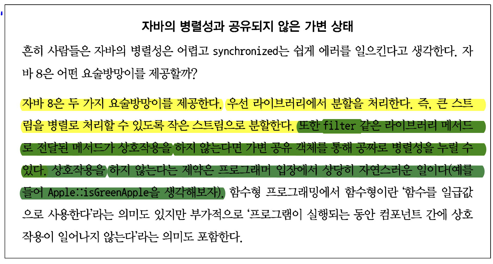 또한 filter 같은 라이브러리 메서드로 전달된 메서드가 상호작용을 하지 않는다면 가변 공유 객체를 통해 공짜로 병렬성을 누릴 수 있다.