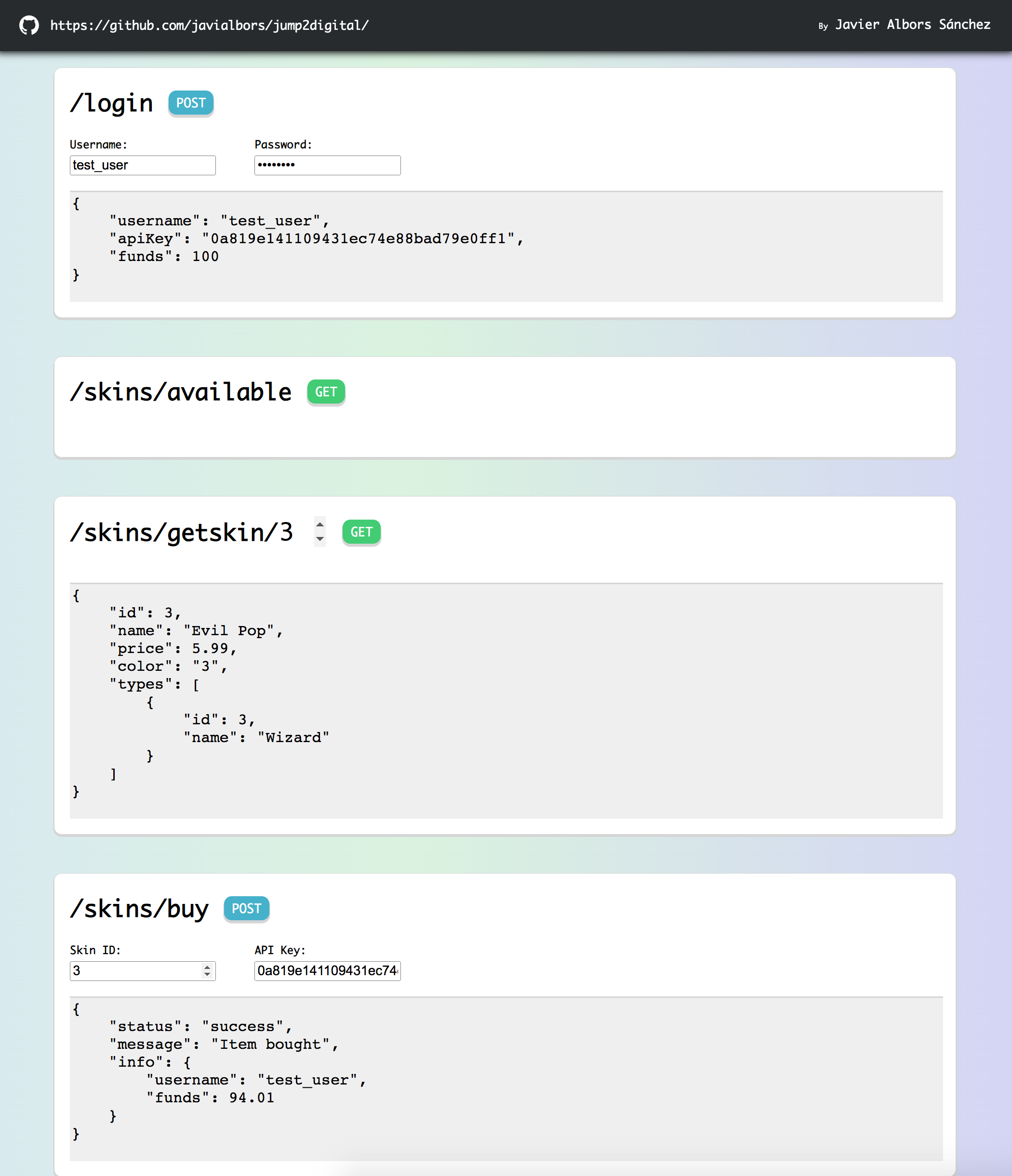 Para poder probar la API de una manera más directa e interactiva, también se incluye en este proyecto el fichero index.html junto con la carpeta assets. Este fichero HTML se puede abrir de manera local en el navegador. En la página web que aparezca, se pueden enviar peticiones a cualquier endpoint de la API y ver el resultado de cada petición.