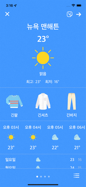 WeatherLook_iOS 기상룩 기상⏰후에 기상☀️에 맞는 옷차림👕을 알 수 있는 날씨앱, '기상룩(WeatherLook)'입니다. 매일 아침 일어나는 '기상' 과 날씨 '기상' 의 중의적 의미를 담고 있으며, 날씨에 따른 옷차림 가이드를 통해 매일 아침 '오늘 뭐 입지?'에 대한 고민을 도와주는 서비스입니다. [Preview] - 기상 및 옷차림 정보 - 자동완성 위치검색, 위치 리스트 추가 / 삭제 기능 - 스티커 Pan, Pinch, Rotation, LongPress Gesture [Reference] Architecture MVVM Coordinator Pattern UI SnapKit Then Reactive RxSwift RxCocoa RxCoreLocation Network Moya