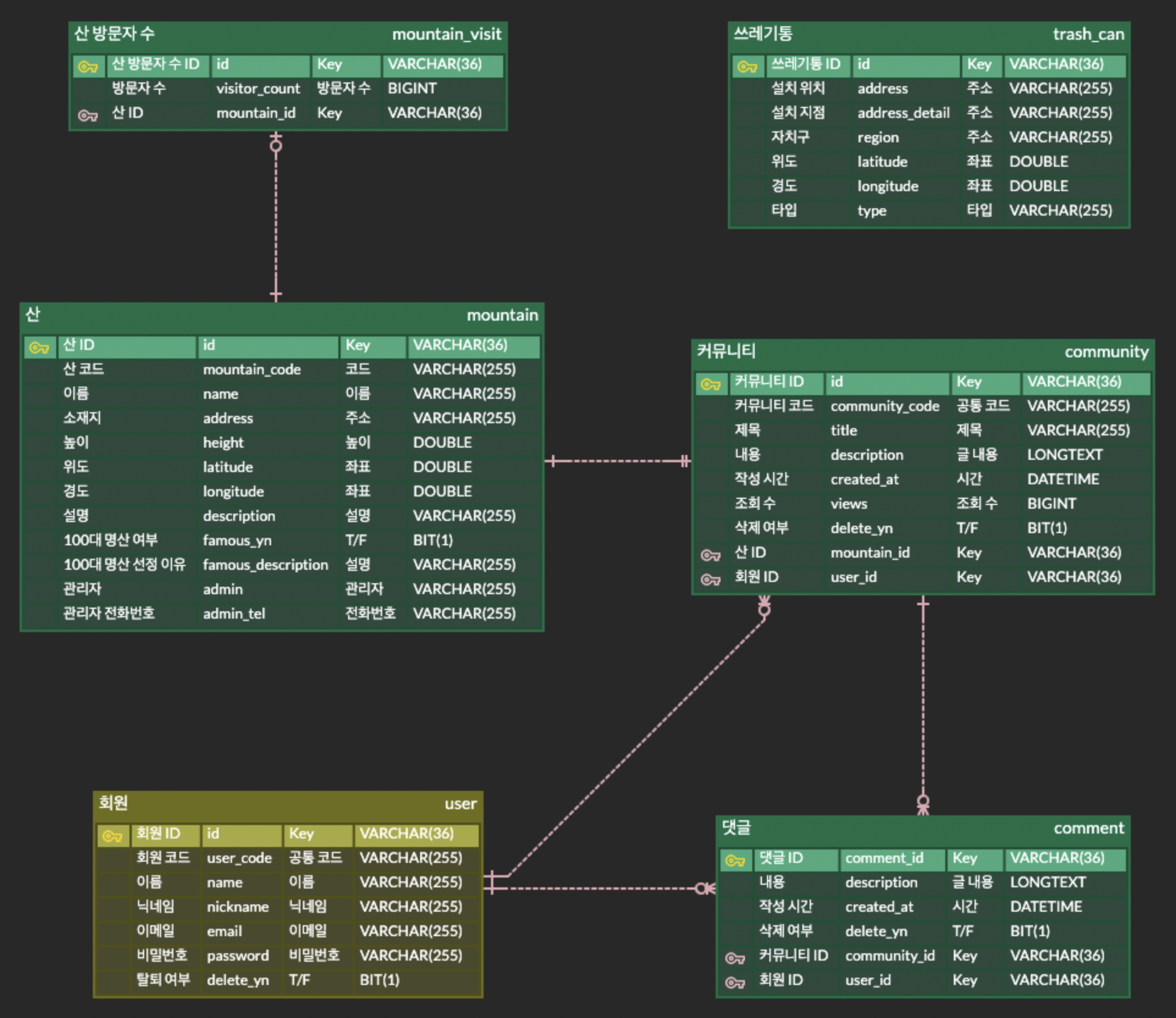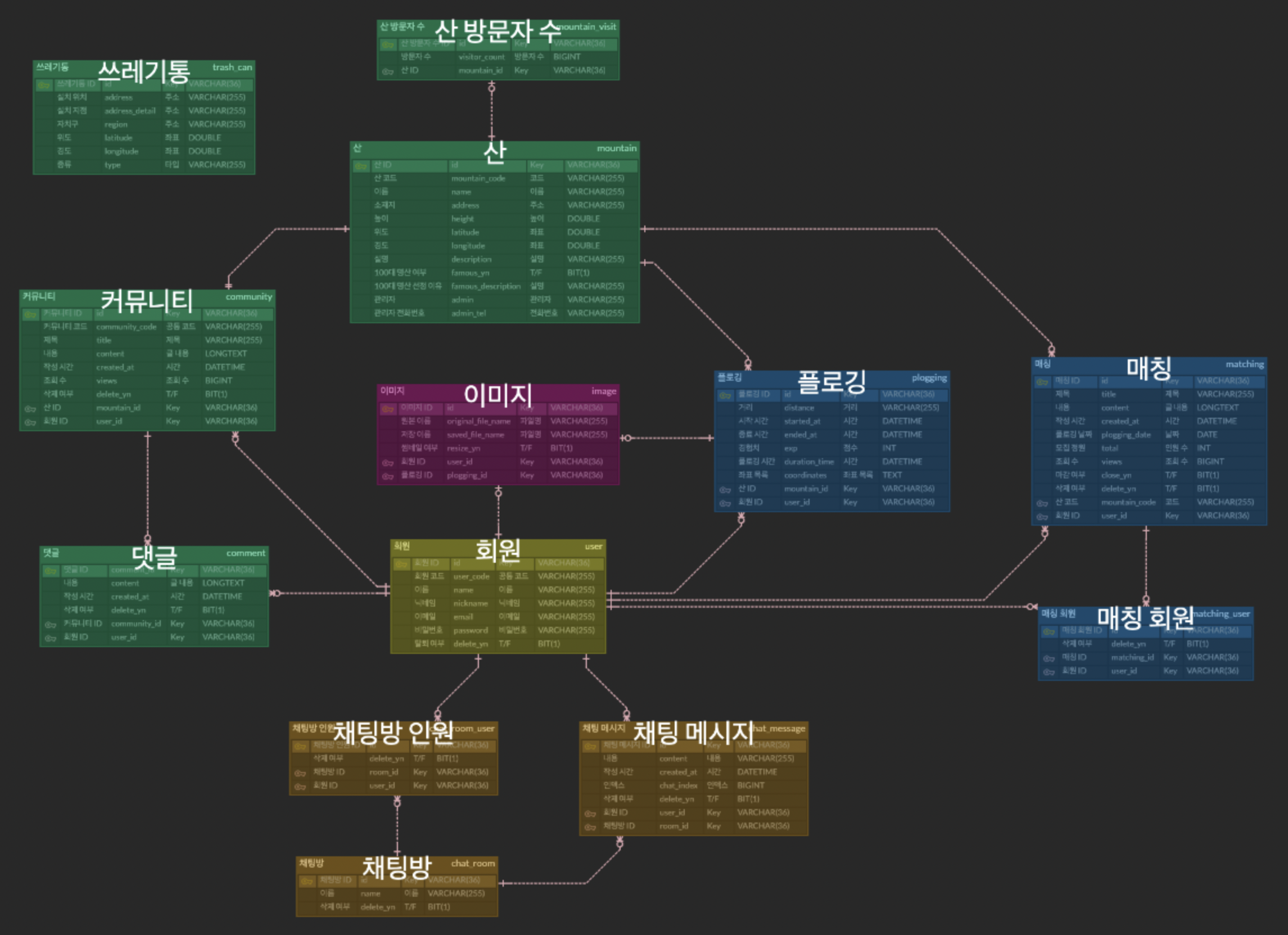 목차 ERD Categorizing User Mountain Plogging Chat ERD ERD Cloud 바로가기 Categorizing User Mountain Plogging Chat