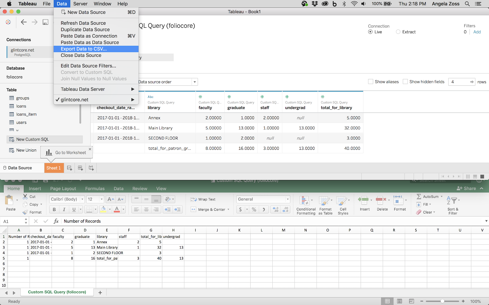 Formatting note: Tableau adds a “Number of Records” column automatically and may reorder other columns alphabetically, so the exported CSV may not match the Tableau table.