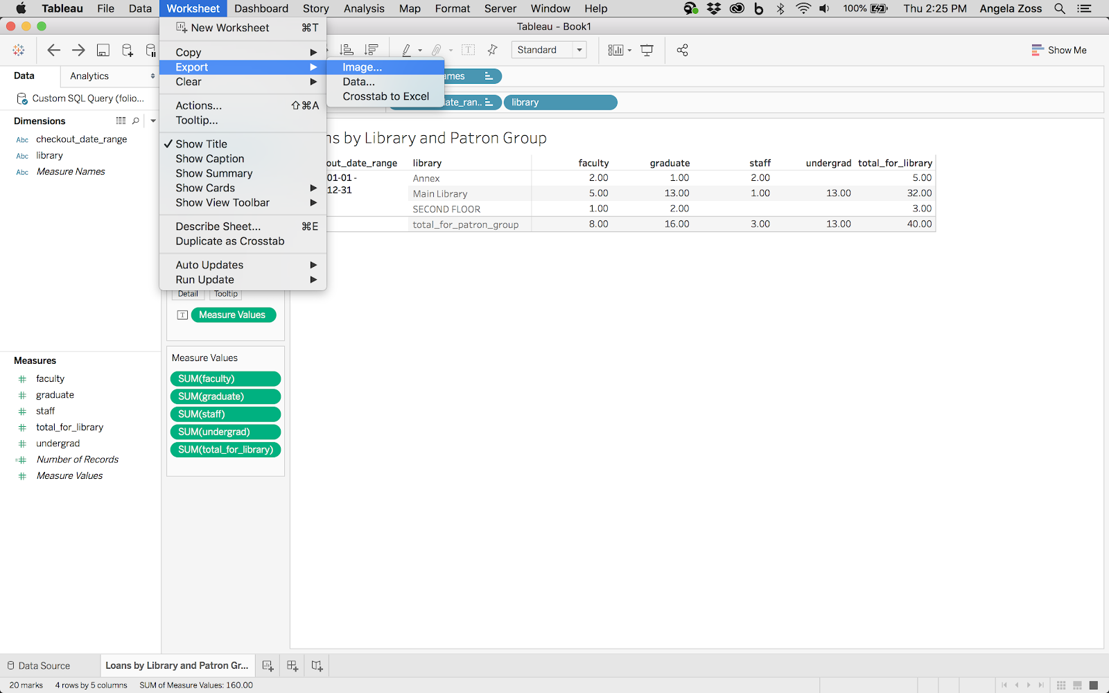 If you create a visualization based on the data from the query, Tableau Desktop will also allow you to export that visualization (either in a worksheet or in a dashboard) as an image (.png, .bmp, or .jpg format). You can also print worksheets and dashboards to PDF. You can also export just the data used in a particular worksheet from the Worksheet menu.