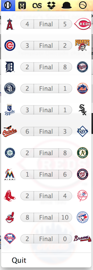 I wanted a little menu on my mac to jump to different games. Here's a first crack at it. Click on the poorly-rendered baseball and today's games are listed. Pick one and it opens your default browser to the Gameday page.