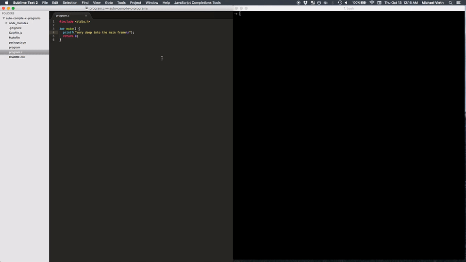 Compiling C programs each time that you save a file using NPM task runner Gulp. Are you tired of switching windows each time you'd like to save and compile your c program? Same.
