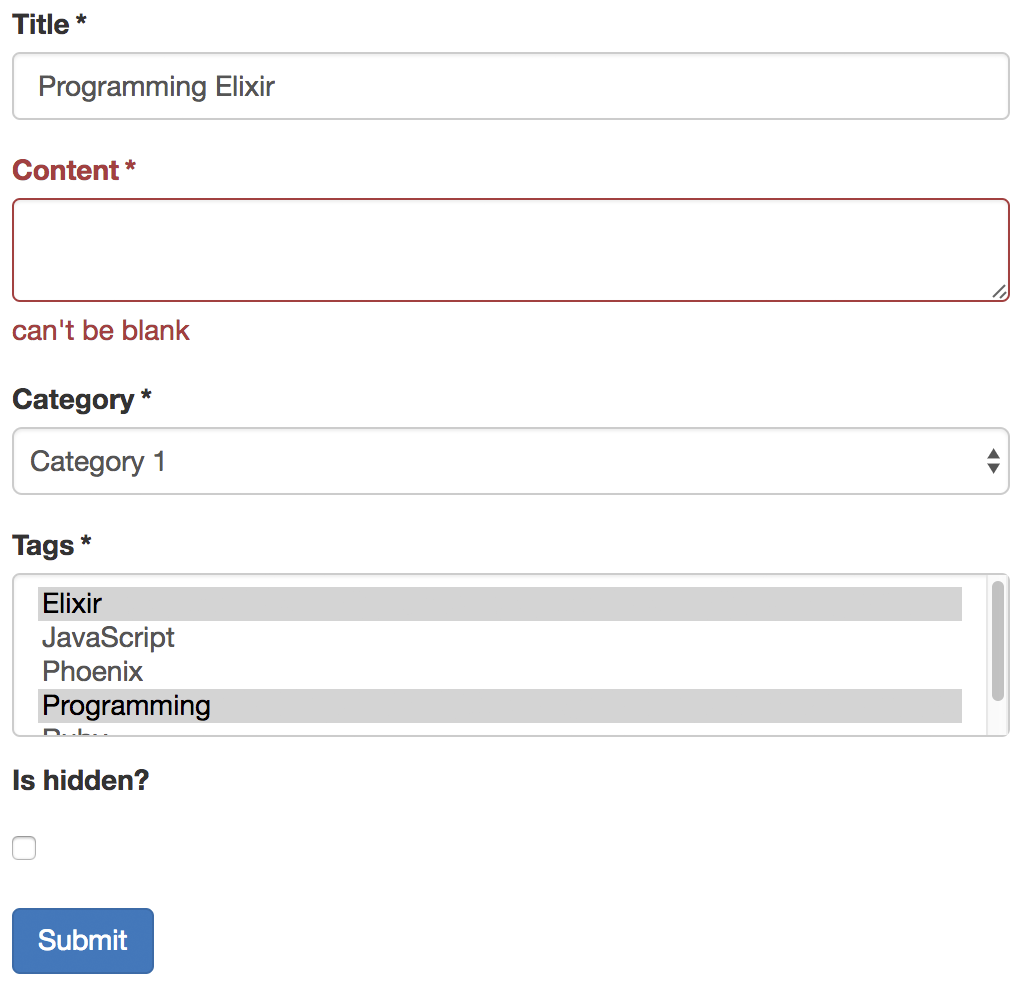 endLet's create a form for Article using Formex. For validation we will use Ecto.Changeset validator