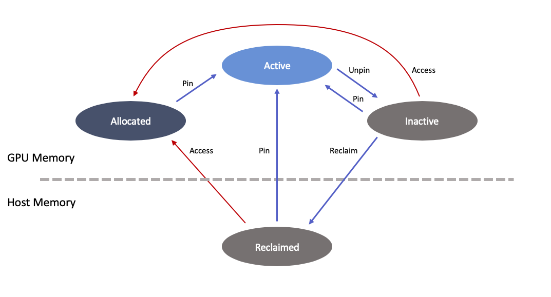- Access: This represents a request to access the tensor data outside of a pin operation. This is rare, but may occur in some cases when accessing the output of an operation. It is even less likely to occur for a tensor that has already been reclaimed (due to the general FIFO management policy for the inactive tensor list and the recent use of the output tensor).