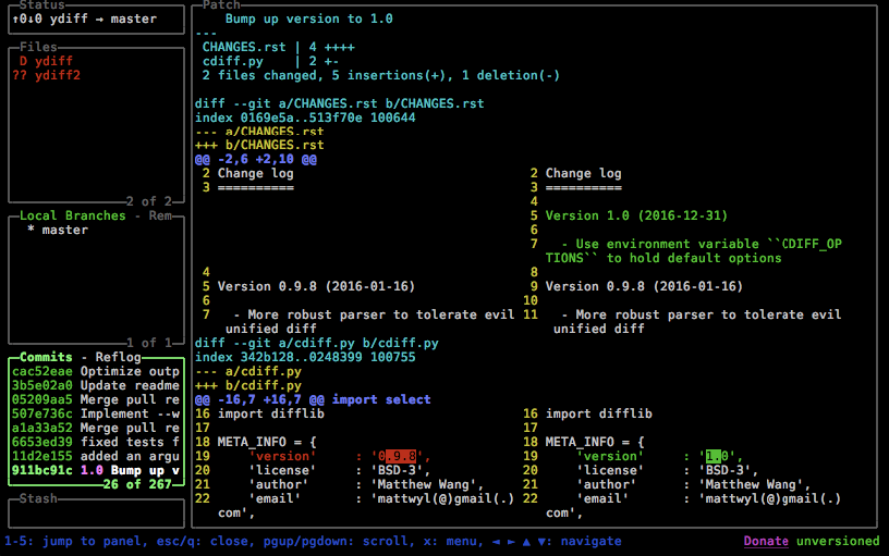 pager: ydiff -p cat -s --wrap --width={{columnWidth}}Be careful with this one, I think the homebrew and pip versions are behind master. I needed to directly download the ydiff script to get the no-pager functionality working.