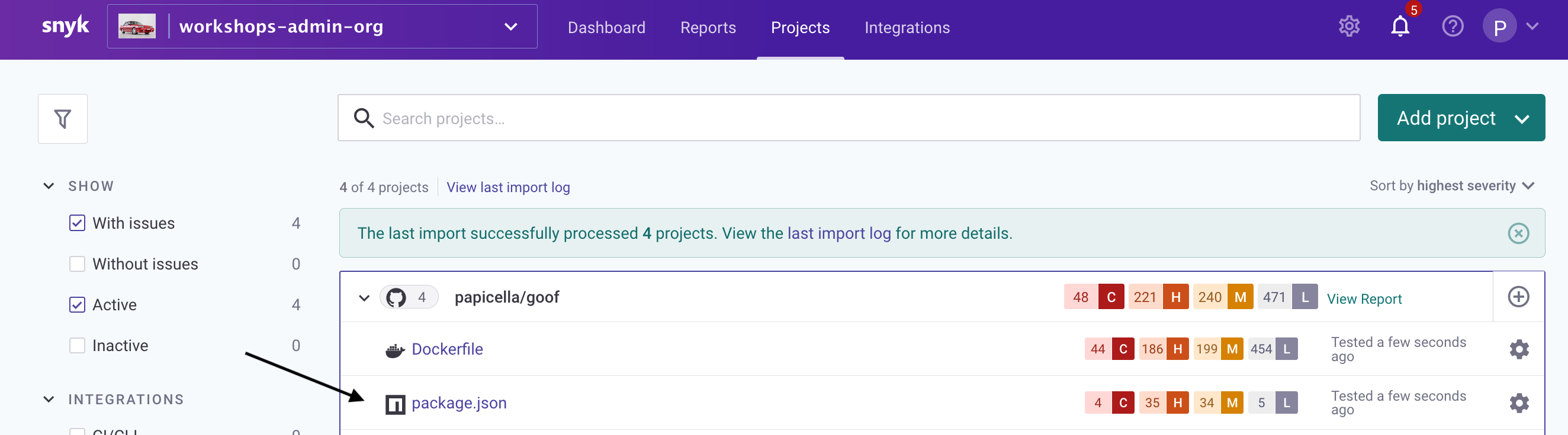 - Back in Snyk we can appreciate that our package.json file has 1 less High Severity Vulnerability if you did fix it