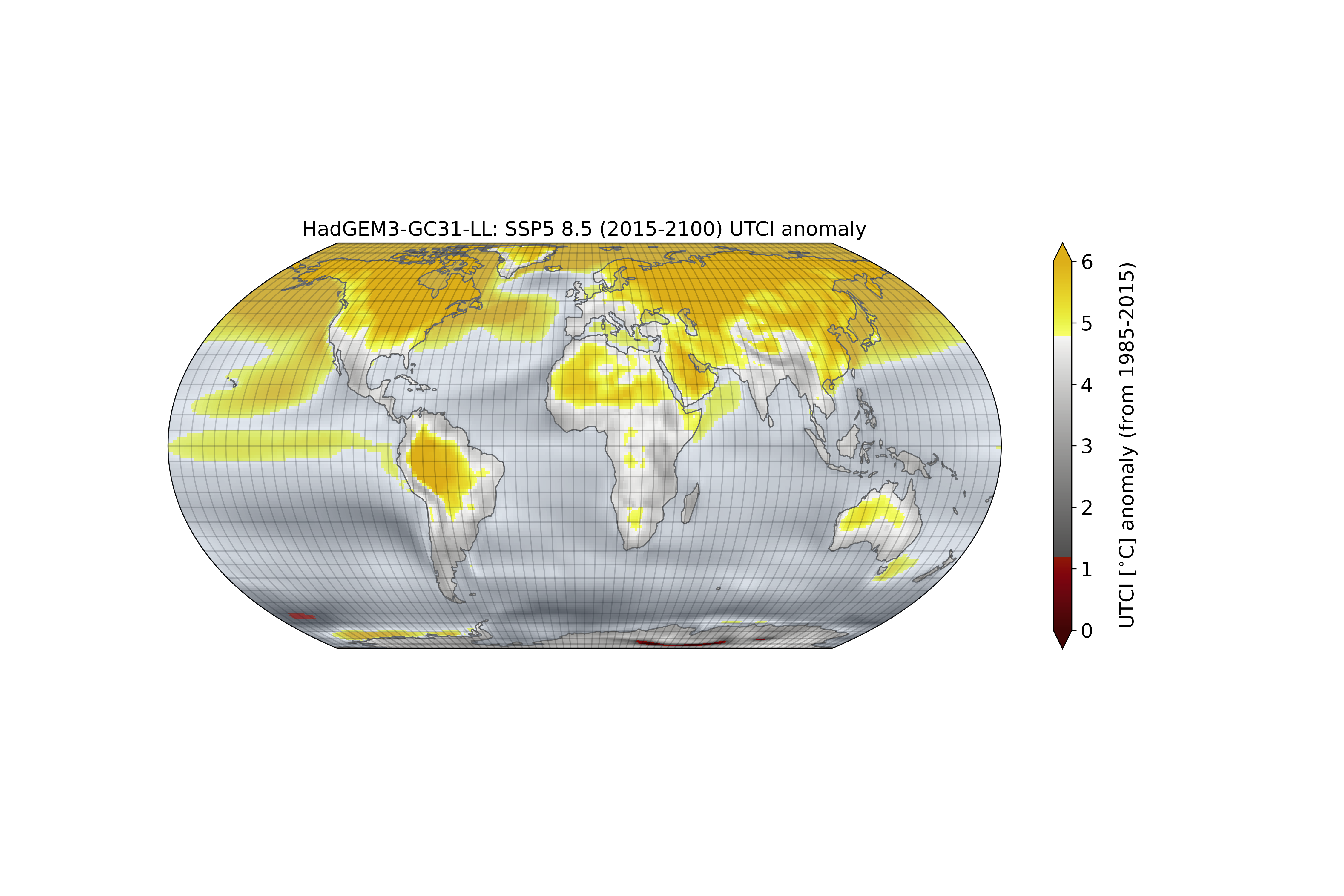 Some thought is needed over the choice of colormap that best provide variational contrast while maintaining perceptual clarity over magnitude. Example of the cmocean Oxy colormap for the HadGEM3 run with the SSP5 8.5 projection. This captures the magnitude well but fails to represent variational constrast well.