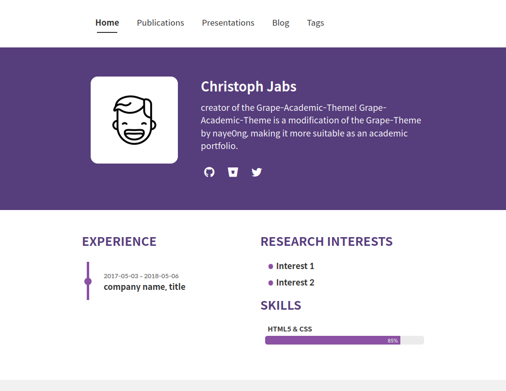 description: creator of the Grape-Academic-Theme! Grape-Academic-Theme is a modification of the Grape-Theme by naye0ng, making it more suitable as an academic portfolio.