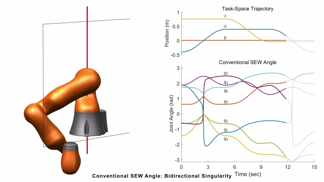 Abstract: Seven-degree-of-freedom (DOF) robot arms have one redundant DOF for obstacle and singularity avoidance which must be parameterized to fully specify the joint angles for a given end effector pose. Commonly used 7-DOF revolute (7R) industrial manipulators from ABB, Motoman, and KUKA and space manipulators like SSRMS or FREND are conventionally parameterized by the shoulder–elbow–wrist (SEW) angle for path planning and teleoperation. We introduce the general SEW angle which generalizes the conventional SEW angle with an arbitrary reference direction function. Redundancy parameterizations such as the conventional SEW angle encounter an algorithmic singularity along a line in the workspace. We introduce a reference direction function choice called the stereographic SEW angle which has a singularity only along a half-line which can be out of reach, enlarging the usable workspace. We prove all parameterizations have an algorithmic singularity. Finally, using the general SEW angle and subproblem decomposition, we provide efficient singularity-robust inverse kinematics solutions which are often closed-form but may involve a 1D or 2D search. Search-based solutions may be converted to finding polynomial roots. Examples are available in a publicly accessible repository.