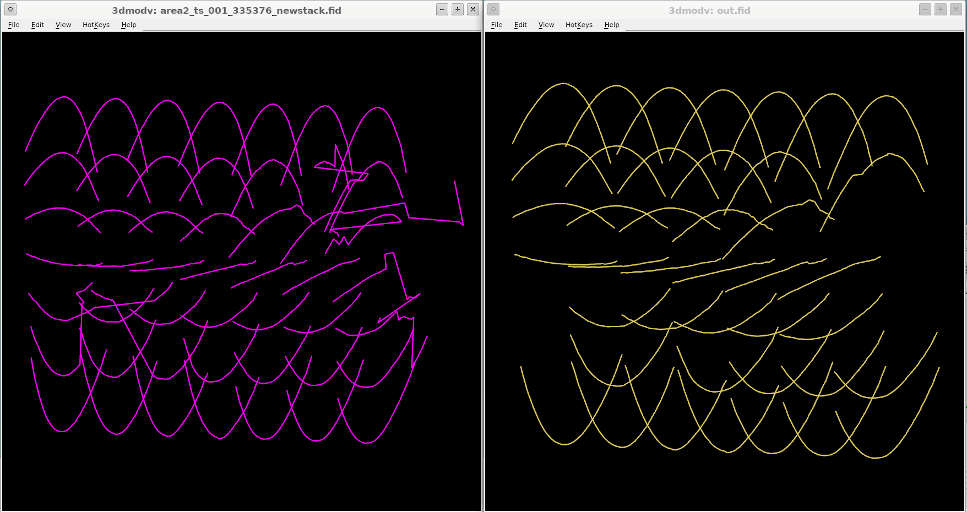For eTomo reconstructions, the routine for removing bad contours is called “Ruotnocon” (reverse of “no contour”). Contours are removed on the basis of high residuals. The following is an extreme example: