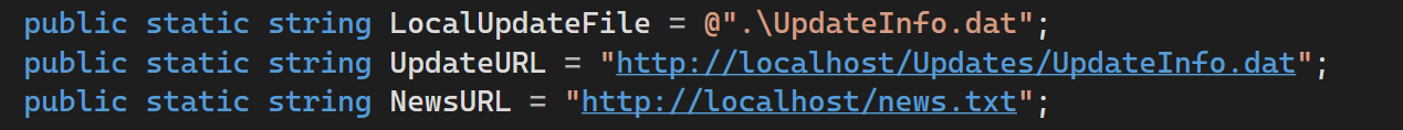 Edit this Line in the config.cs to where you hold your UpdateInfo.dat file generated with the Update Maker Also edit the NewsURL variable to point to a valid txt file on your web server. (NOTE: The app won't run well unless the news txt file is pointed correctly)