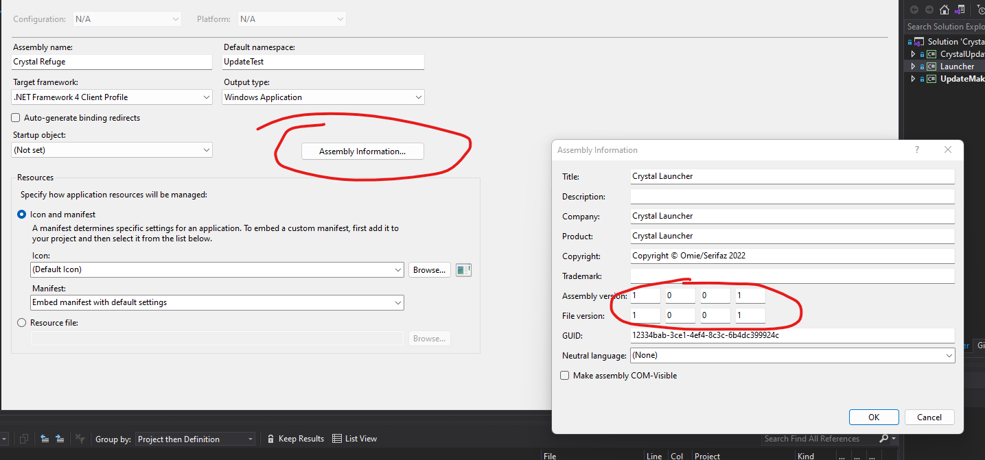 Step #4: Place your current version number of the assembly in the Version field. NOTE: All updates that you publish, you will need to include a new version of the launcher with a version (In the compiled Launcher's Assembly Version) that matches the the version number generated in the UpdateInfo.dat Just make sure your launcher assembly version matches the update. you can do that by opening the Launcher project properties