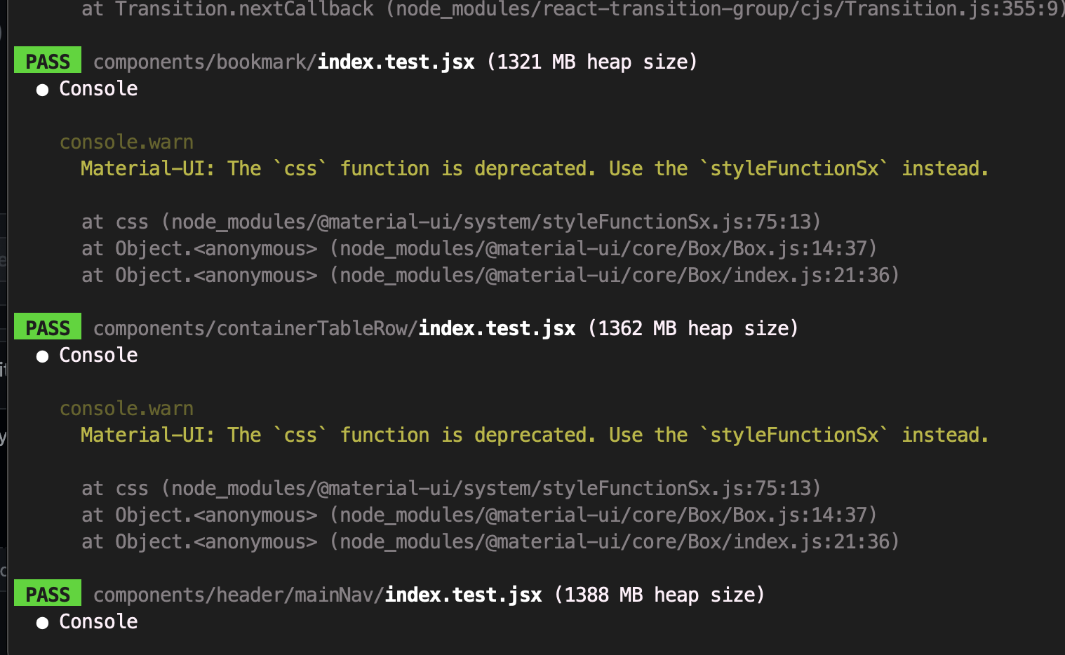 Okay, just did a quick test to see just how bad the memory leaking is, and it seems to be on the order of 20-100mb per test file: After getting a memory profile out of the chrome developer tools, it seems to be largely material-ui related. We might wish to try to upgrade to MUI v4.12, as we're currently using the older 4.11, and there could be performance improvements. Alternatively, we could upgrade to MUI v5, and there's a guide here on doing that: https://mui.com/guides/migration-v4/ More information on MUI memory leaks: mui/material-ui#21528 There is a codemod available for migrating up, which would hopefully automatically upgrade us from Also, somewhat related to this PR, currently the project depends on There's a guide here: https://www.leighhalliday.com/mock-fetch-jest (cc @NSeydoux: we may wish to use mock-fetch-jest in the SDKs too!) |