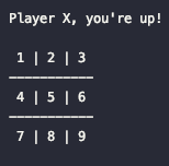- Goal: a command line Tic Tac Toe game between two human players on a 3 x 3 board