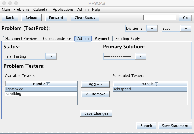 3.Click “Admin” tab, and select Status to “Final Testing”, then select user “lightspeed” and click “Add” to assign him as a tester, and then click “Save Changes”