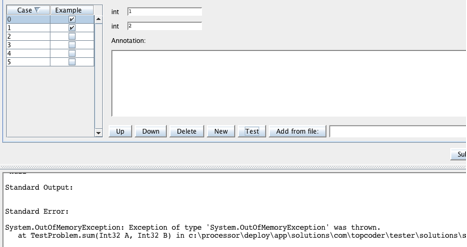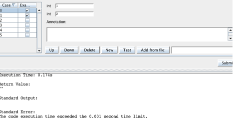 3.Go to “Test Data” tab, add at least 5 test cases, make 2 of them as an example, click “Submit” make sure the problem can be submitted successfully.