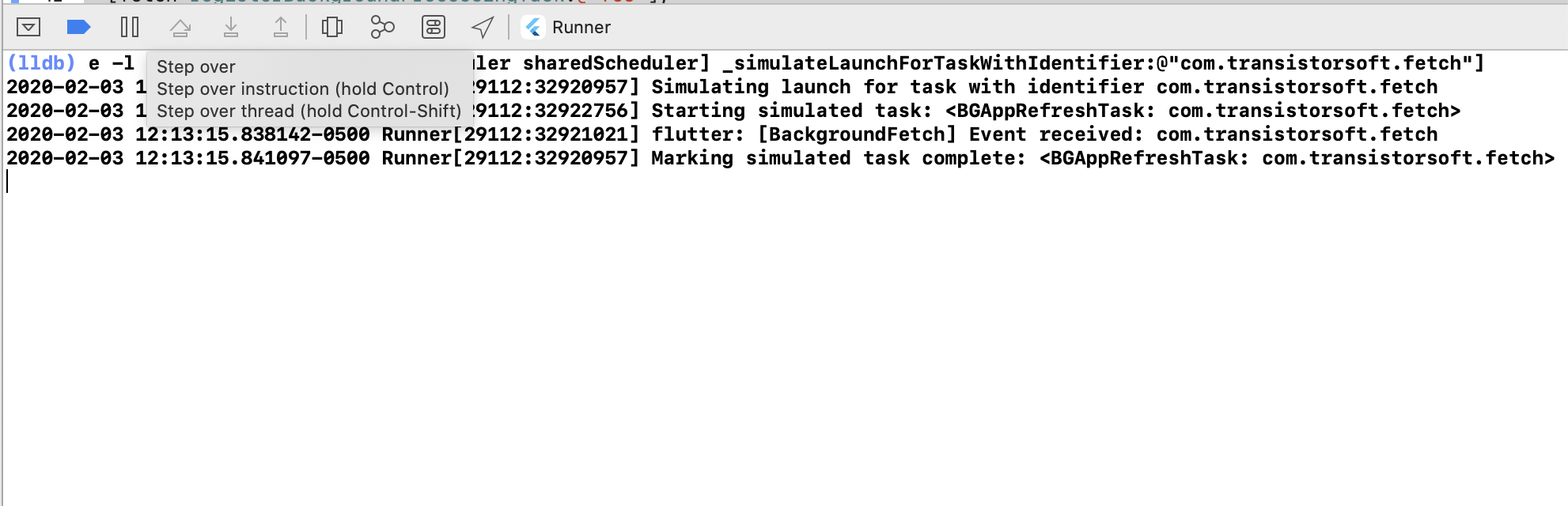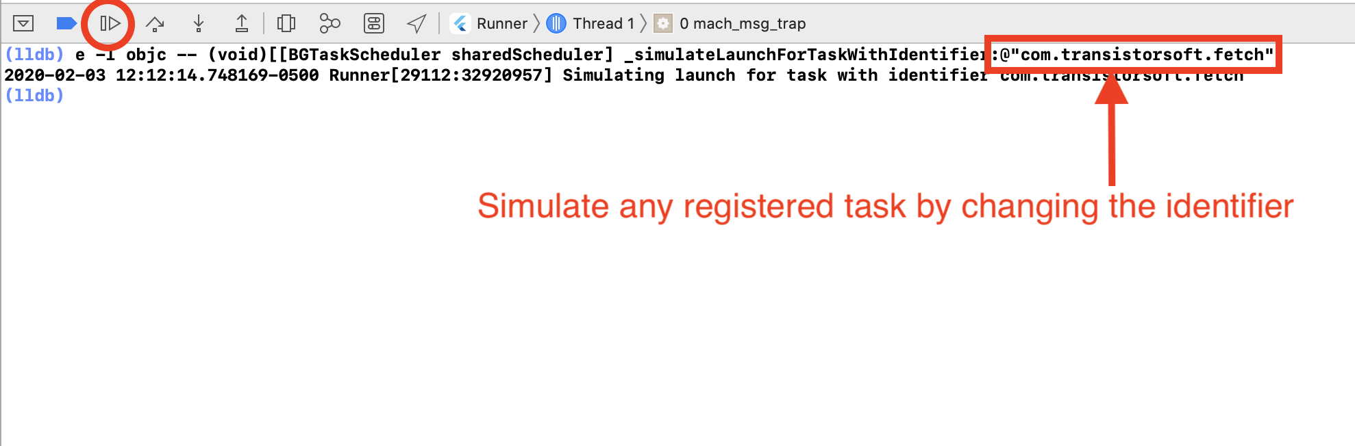 e -l objc -- (void)[[BGTaskScheduler sharedScheduler] _simulateLaunchForTaskWithIdentifier:@"com.transistorsoft.fetch"]