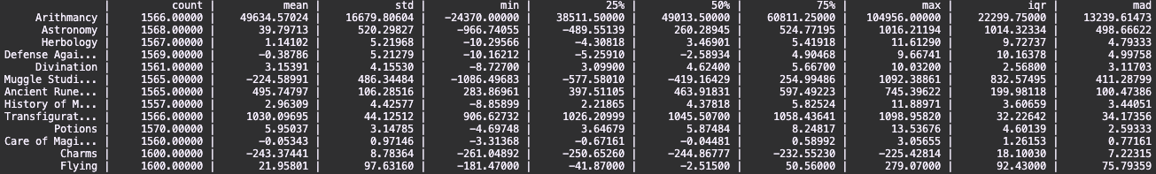 This script rebuilds the describe function of pandas. It displays for each column the mean, standard deviation, minimum and maximum ...
