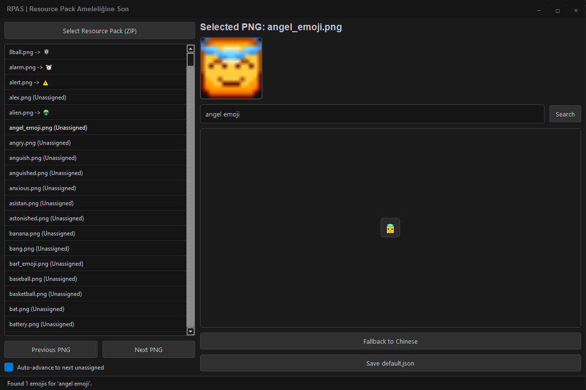 RPAS helps Minecraft resource pack creators automatically generate font mappings by allowing you to assign emoji characters to PNG images. The application searches through an emoji database, lets you preview images, and outputs a properly formatted default.json file that Minecraft can use for custom fonts.