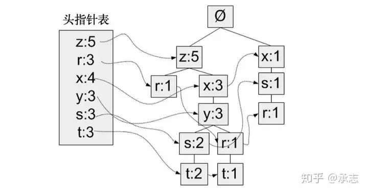 - 將每筆交易集合(每行資料為一交易集合)依照出現頻率排序(根據huffman樹的想法,將出現頻率高的數字盡量往根節點放,加快遍歷時間) (第二次掃描整個資料集)