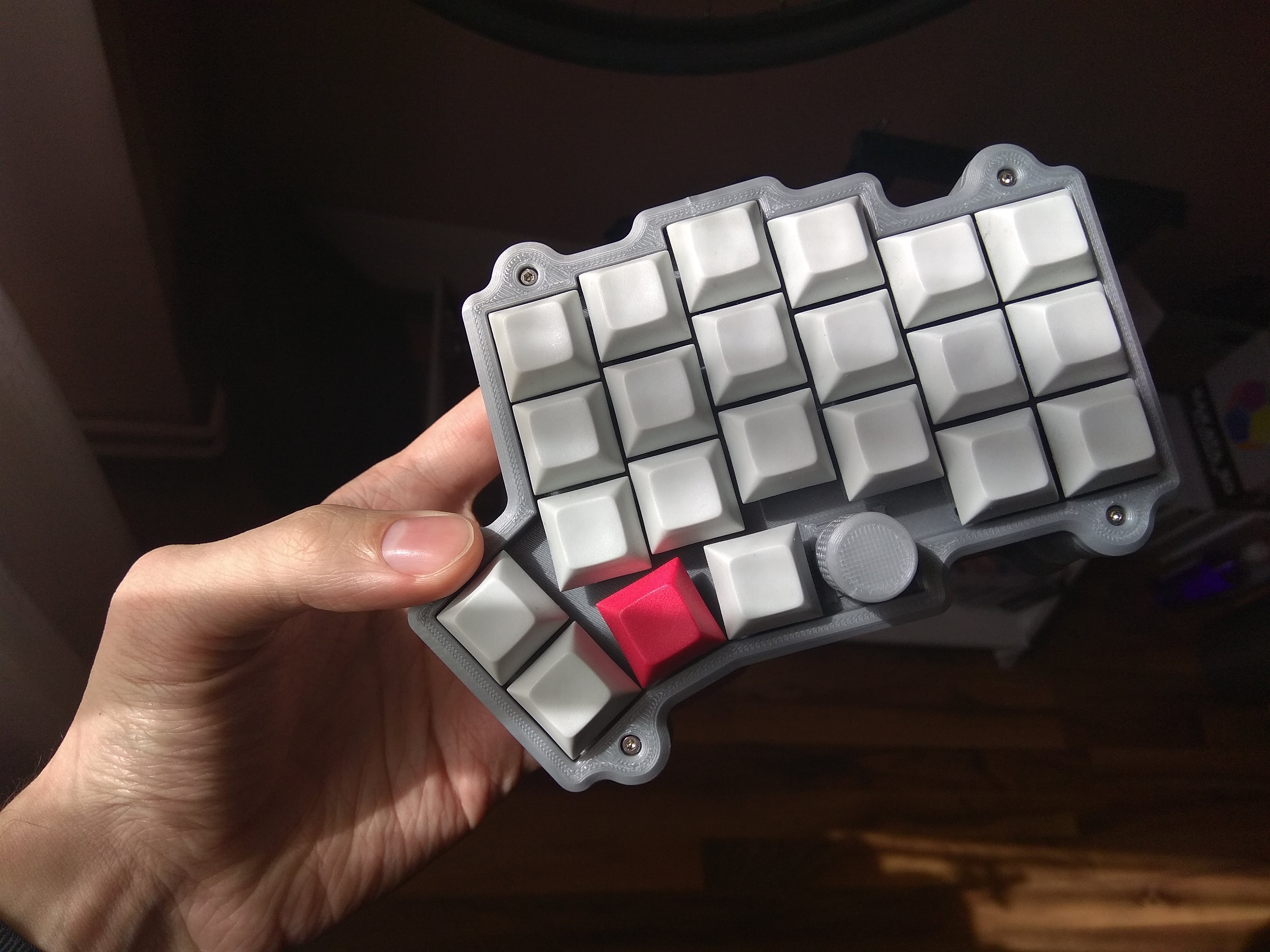 The VOID Ergo S is a 3d printed, handwired, split keyboard with a layout similar to the Iris/Corne/Kyria, running QMK Firmware on Pro Micro controllers. Connection between the two halves of the keyboard is made with an aux cable via serial.