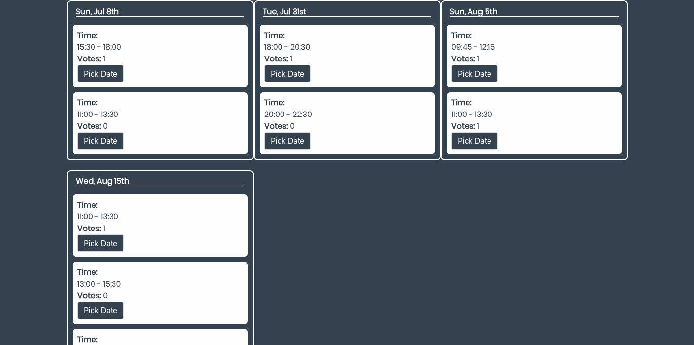 Voting process. The invitees as well as the organizer can view the event and vote on the time slots that are the most convenient for them. They simply click Vote on each slot they want to select and then click Submit votes at the bottom. If the user is also the organizer there will be two buttons. One for voting and one for picking the final time.