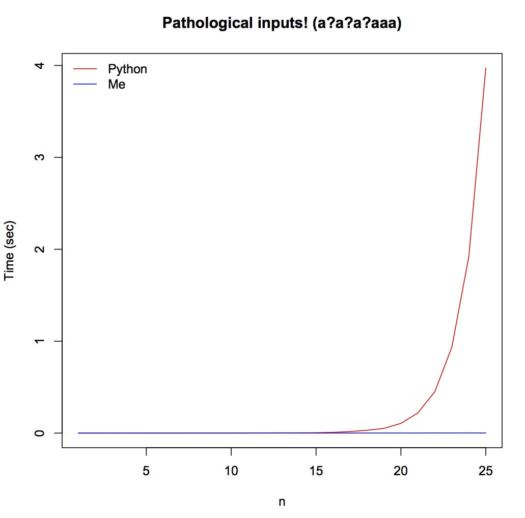 This regex engine underperforms Python's re module on normal inputs (using Glenn Fowler's test suite -- see below), however it outperforms significantly on pathological inputs.