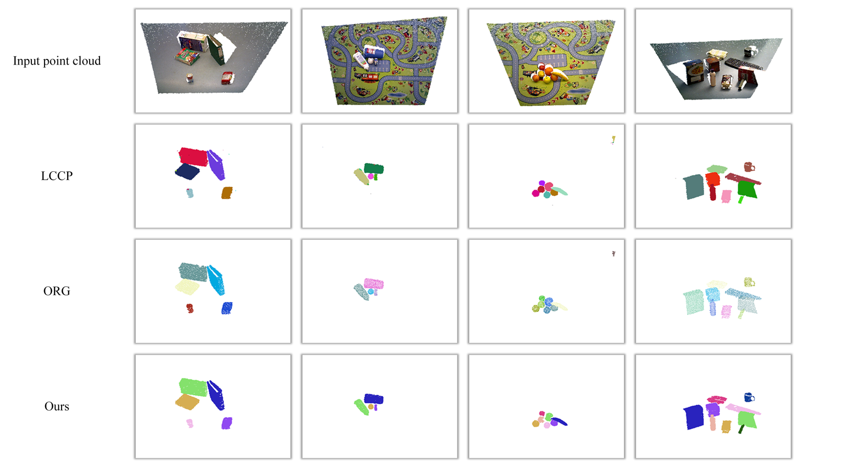 The algorithm is written in C++ and runs on Intel i7-11700K CPU@3.6GHz with 32GB RAM. To compare the performance of the proposed algorithm, we compared it with two other approaches for point cloud segmentation.